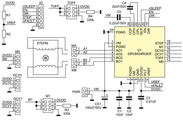 Uzwojenia silnika podłączone są do wyjść mostków U1 poprzez złącza MA i MB. Dzielnik R1, R2 określa napięcie odniesienia VREF dla układu regulacji prądu uzwojeń. Maksymalne dopuszczalne napięcie VREF wynosi 3,3 V. Prąd uzwojeń określony jest wzorem: