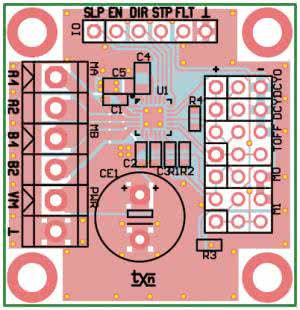 Schemat modułu został pokazany na rysunku 2. Aplikacja układu DRV8424 jest bardzo prosta, moduł zasilany jest poprzez złącze PWR napięciem VM z zakresu 4,5...33 V, dobranym w zależności od zastosowanego silnika. Zasilanie odsprzęgane jest przez kondensatory CE1, C1 i C2. Należy pamiętać o odpowiedniej zewnętrznej pojemności filtrującej, zdolnej odebrać prądy hamowania z uzwojeń w docelowej aplikacji.