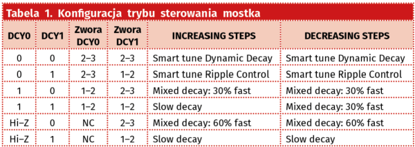 - DCY0/1 – określającymi tryb sterowania mostkiem H wpływającym na szybkość zaniku prądu uzwojeń w trybie Smart/Fast/Slow/Mixed lub w trybie kontroli tętnień, zgodnie z tabelą 1. Odpowiednie sterowanie tranzystorami mostka H umożliwia zanik prądu uzwojeń w trybie przeciwprądu (Fast – reverse), recyrkulacji (Slow – brake) lub mieszanym (30/60% Fast);