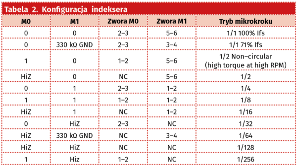 W ofertach producentów dostępnych jest wiele kompleksowych rozwiązań driverów silników krokowych. Jednym z najnowszych opracowań jest układ TI o oznaczeniu DRV8424, którego strukturę wewnętrzną pokazano na rysunku 1. Zwiera on kompletny sterownik silnika krokowego z obsługą mikrokoku, aż do 1/256 oraz stopień mocy z dwoma mostkami H na tranzystorach MOSFET. Charakteryzuje się niewielkim napięciem nasycenia i jest zdolny do dostarczenia ciągłego prądu 2,5 A na każdy mostek (w szczycie 4 A), przy napięciu zasilania w zakresie 4,5...33 V.