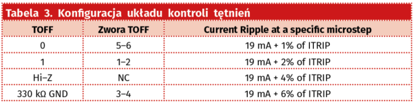 - TOFF – określającą tryb kontroli tętnień prądu uzwojeń, zgodnie z tabelą 3.