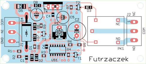 Podłączenie układu nie powinno nastręczać trudności: do złącza J1 należy doprowadzić zasilanie obecne cały czas (VCC) oraz masę (GND). Sygnał sterujący, czyli np. napięcie pochodzące ze stacyjki samochodowej, winno być podłączone między zacisk IN a masę. Przekaźnik zostanie zwarty (zwarcie styków NO i COM) natychmiast po pojawieniu się sygnału sterującego, a rozwarcie (zwarcie styków NC i COM) nastąpi po upływie określonego czasu od jego zaniku.