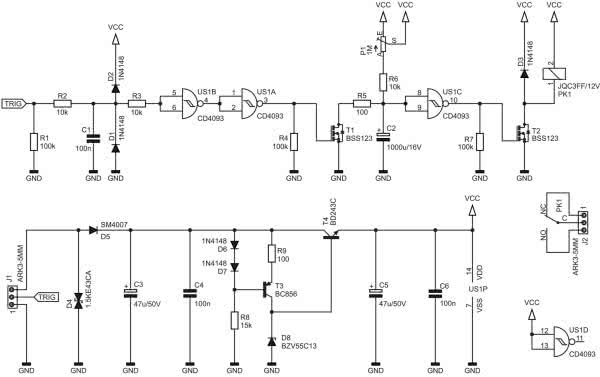 Wejście sygnału sterującego (linia TRIG) jest ściągane do masy rezystorem R1. Diody D1 i D2 ograniczają jego wartość do takiego poziomu, aby nie spowodować uszkodzenia następnych obwodów. Rezystor R2 ogranicza prąd tych diod, a w połączeniu z kondensatorem C2, stanowi prosty filtr dolnoprzepustowy, który eliminuje szybkozmienne zakłócenia, mogące przypadkowo wyzwolić układ.