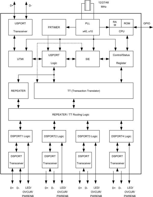 Dzięki wysokiej skali integracji układ zawiera w sobie praktycznie wszystkie elementy niezbędne dla realizacji huba USB, ograniczając aplikację do kilku elementów biernych. Schemat ideowy układu został pokazany na rysunku 2. Hub zasilany jest z portu komputerka SBC poprzez złącze USB. Dla uproszczenia układu zrezygnowano z zarządzania zasilaniem pozostawiając jedynie bezpiecznik zbiorczy F1 na szynie V50.
