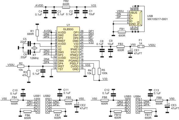 Dzielnik R2, R3 odpowiedzialny jest za restart GL850 po podłączeniu go do SBC. Rezystory R4, R5 wyprowadzeń PGANG/PSEL określają tryb pracy U1, kwarc XT zapewnia jego taktowanie. Złącza USB1...4 wyprowadzają porty downstream GL850G, pozostałe elementy odsprzęgają i filtrują zasilanie.
