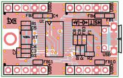 Układ został zmontowany na niewielkiej dwustronnej płytce drukowanej, której schemat i rozmieszczenie elementów pokazano na rysunku 3.