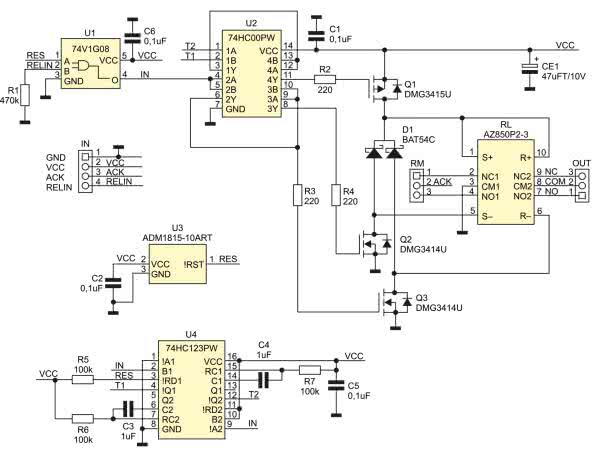 Sygnał RELIN, aktywny stanem wysokim, poprzez bramkę AND układu U1, doprowadzony jest do inwertera U2-2, skąd steruje bramką tranzystora Q3 i inwerterem U2-3 sterującym bramką tranzystora Q2. Q2 odpowiada za aktywację cewki S (Set) przy stanie wysokim sygnału IN, Q3 za cewkę R (Reset) w stanie niskim IN. Sterowanie Q2, Q3 poprzez inwerter U2-3 zapobiega jednoczesnemu wysterowaniu obu cewek S/R. Układ U3 odpowiada za ustawianie przekaźnika w położenie OFF (rozwarte styki NO/CM), gdy napięcie zasilania spadnie poniżej 2,9 V.