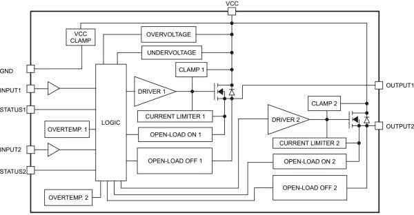W module zastosowano układ VND830, który w swojej strukturze zawiera dwa identyczne kanały kluczujące z tranzystorami MOSFET. Każdy kanał posiada zabezpieczenie termiczne, blokadę podnapięciową i ograniczenie prądu obciążenia. Budowa wewnętrzna układu została pokazana na rysunku 1.