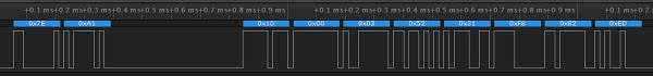 Przykładowa ramka wysłana przez czujnik FLVSS została pokazana na rysunku 1. Jak widać – na zapytanie odbiornika 0x7E 0xA1 czujnik odpowiedział sekwencją 0x10, 0x00, 0x03, 0x20, 0x7F, 0xB7, 0x77, 0x1E. Spróbujmy to „rozłożyć” na czynniki pierwsze. Pierwszy bajt 0x10 to znacznik początku ramki z odpowiedzią, jest on stały.