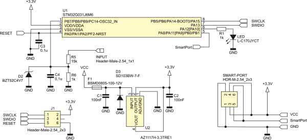 Schemat elektryczny jest zredukowany do niezbędnego minimum. Oprócz samego procesora zawiera stabilizator napięcia 3,3 V, oraz dzielnik napięcia zrealizowany na elementach R5 i R6 wraz z diodą zenera zabezpieczającą port przed wystąpieniem zbyt wysokiego napięcia. Dioda LED sygnalizuje poprawną komunikację na porcie SmartPort. W projekcie użyto stabilizatora typu LD1117S33, dzięki czemu czujnik może być zasilany napięciem powyżej 5 V bezpośrednio z odbiornika zasilanego np. z akumulatorów litowych.