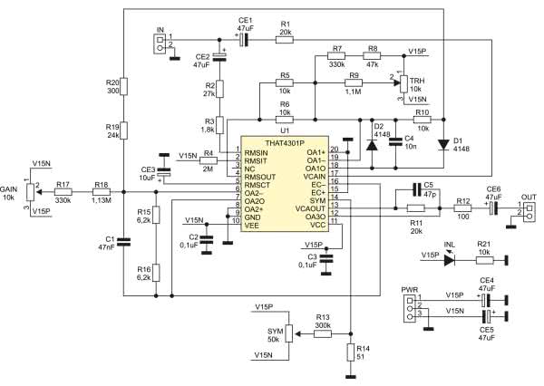 Schemat modułu został pokazany na rysunku 2. Bazuje na rozwiązaniu zaproponowanym przez producenta układu w nocie dn106. Sygnał wejściowy z gniazda IN doprowadzony jest poprzez elementy CE1, R1 do stopnia o regulowanym wzmocnieniu VCA oraz poprzez elementy CE2, R2 do wejścia detektora RMS. Kontrola wzmocnienia odbywa się poprzez połączenie wyjścia detektora RMS z odwracającym wejściem sterującym VCA.