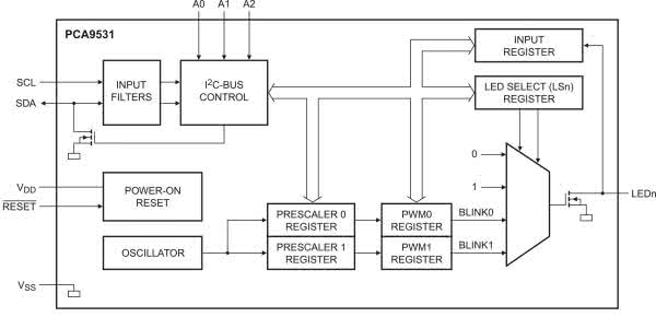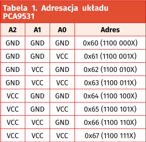 Za obsługę miniklawiatury odpowiada ekspander I/O – układ typu PCA9531, który oprócz obsługi dwukierunkowych portów I/O jest rozbudowany o dwa konfigurowane generatory umożliwiające sterowanie częstotliwością migania podłączonych diod LED. Schemat wewnętrzny układu PCA9531 został pokazany na rysunku 1. Takie rozwiązanie umożliwia sprzętowe sterowanie diodami LED bez zbędnego obciążenia procesora sterującego.
