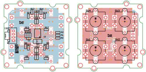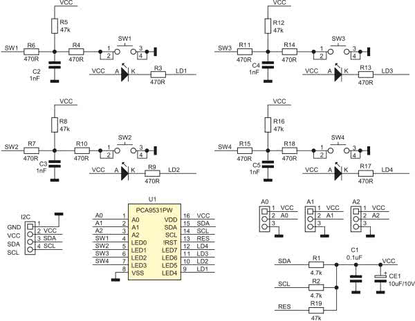 Schemat modułu został pokazany na rysunku 2. Porty ekspandera zostały podzielone na dwie grupy. Pierwsza zawiera wyprowadzenia oznaczone LED0...LED3, które zostały skonfigurowane jako wejścia i służą do odczytu stanu przycisków SW1...SW4. Przyciski uzupełnione są w proste filtry RC eliminujące zakłócenia z drgań styków. Wyprowadzenia oznaczone LED4...LED7 sterują wbudowanymi w przyciski diodami LED. W układzie zastosowano popularne przyciski typu TACT-24N-F-Ix firmy NINIGI. W zależności od typu możemy wybrać, odpowiednio do aplikacji, jeden z pięciu kolorów podświetlenia (czerwony, zielony, żółty, niebieski, biały).