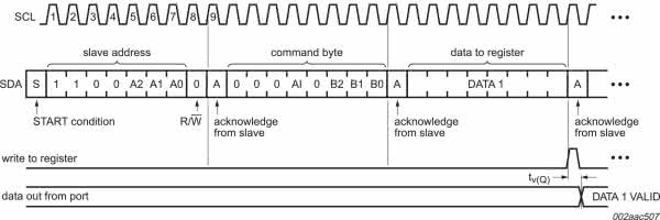 Zapis do rejestrów odbywa się w taki sposób, jak obrazuje to rysunek 3. Po adresie slave zapisywany jest bajt sterujący, adresujący rejestr do zapisu (B2, B1, B0) oraz określający tryb autoinkrementacji adresu AI (AI=1). Sposób odczytu rejestrów został pokazany na rysunku 4.