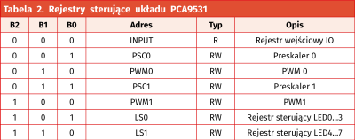 Układ PCA9531 posiada siedem rejestrów sterujących, które zestawiono w tabeli 2.