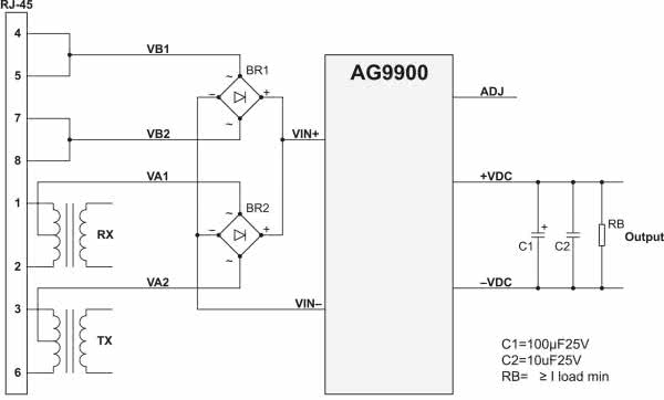 W układzie zastosowano gotowy moduł zasilacza PoE. Wśród dostępnych na rynku opracowań, wybrany został moduł z rodziny Ag990xLP firmy Silvertel. Moduły są zgodne z IEE802.3af, obsługują urządzenia Class0, dopuszczają zasilanie 36–57 V (PSE), posiadają pełne zabezpieczenie wyjścia przetwornicy gwarantujące niezawodną pracę oraz możliwość kalibracji napięcia wyjściowego w zakresie ok. ±10%.