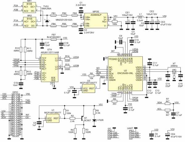 Schemat modułu karty sieciowej z PoE został pokazany na rysunku 2. Układ składa się z dwóch bloków: interfejsu Ethernet i zasilacza PoE. Rolę interfejsu pełni znany, sprawdzony i wspierany przez Linuxa układ ENC28J60. Jest to co prawda tylko interfejs 10BASE-T, ale w domowej automatyce taka przepustowość jest wystarczająca. Układ U2 zasilany jest napięciem 3,3 V bezpośrednio z Raspberry. Układ U3 zapewnia reset U2 po włączeniu zasilania. Do komunikacji z Raspberry układ ENC28J60 używa interfejsu SPI. Odbiornik i nadajnik U2 współpracuje z gniazdem RJ45 ze zintegrowanym transformatorem ETH. Wbudowane w gniazdo diody LED sygnalizują stan interfejsu. Wyprowadzenia VC+/– umożliwiają podłączenie przetwornicy PoE korzystającej zarówno z przesyłu wydzielonymi parami 4/5 i 7/8 jak i wykorzystującymi linie danych 1/2 i 3/6.