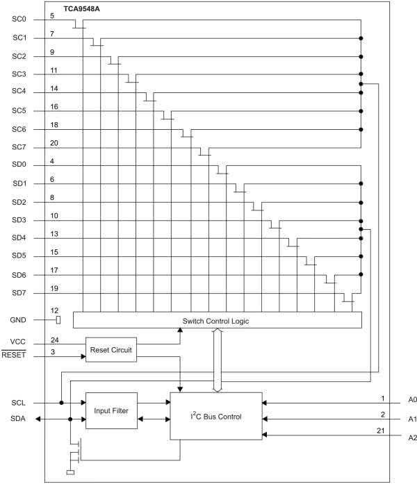 Moduł bazuje na układzie multipleksera magistrali I2C typu TCA9548A, którego schemat wewnętrzny został pokazany na rysunku 2. W swojej strukturze układ zawiera ośmiokanałowy multiplekser cyfrowy, którego aktywny kanał (jeden lub kilka) wybierany jest poprzez bezpośrednią konfigurację rejestru i nie wymaga dodatkowych wyprowadzeń sterujących. Dzięki elastycznej adresacji na jednej magistrali może współpracować do ośmiu takich układów, co daje możliwość współpracy z 64 układami slave pozbawionymi możliwości zmiany adresacji, o ile utrzymamy parametry elektryczne magistrali I2C.