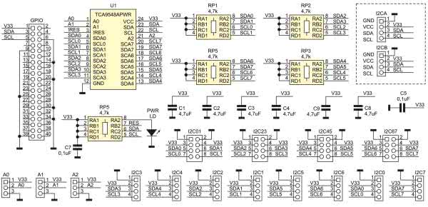 Dioda LD sygnalizuje obecność zasilania, rezystory RP1...RP5 podciągają wstępnie magistralę, ich wartość można zoptymalizować w zależności od docelowego napięcia zasilania układu. Zwory A0...A2 umożliwiają zdefiniowanie adresu bazowego TCA9548A pomiędzy 0x70...0x77. Domyślnie na płytce wszystkie ustawione są w stan wysoki (zwarcie do V33), a układ U1 widoczny jest pod adresem 0x77.