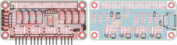 Moduł został zmontowany na dwustronnej płytce drukowanej, której schemat został pokazany na rysunku 3. Sposób montażu jest klasyczny i nie wymaga opisu. Zmontowany moduł pokazuje fotografia tytułowa. Zamiennie do ukłądu TCA9548A (TI) można zastosować układ PCA9548A (NXP).