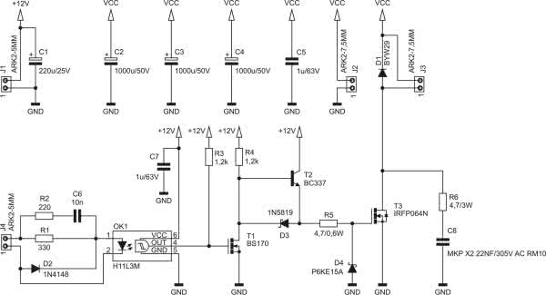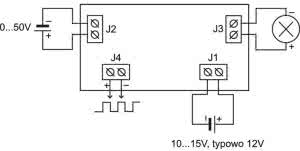 W układzie zastosowano oddzielne wejście zasilania dla części sterującej tranzystorem T3. To daje duże możliwości jeżeli chodzi o sterowane obciążenie, bowiem jego napięcie zasilania może być dowolnie niskie. Nie może przekraczać 50 V, aby nie doszło do przebicia kondensatorów elektrolitycznych i samego T3.
