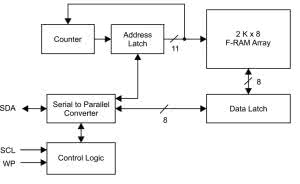 W module zastosowano pamięć FRAM typu FM24LC16B firmy Cypress/Infineon, której blokowy schemat wewnętrzny został pokazany na rysunku 1. Charakteryzuje się ona małym poborem prądu – 100 μA oraz wysoką liczbą cykli zapisu – 1014. Będzie przydatna w aplikacjach zapisujących większą ilość danych (konfigurację) np. podczas zaniku zasilania, gdy czas zapisu jest krytyczny dla aplikacji lub gdy chcemy zapisywać dane często, a zależy nam na długiej trwałości układu pamięci nieulotnej.