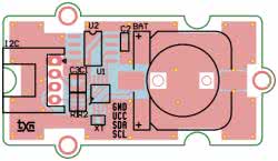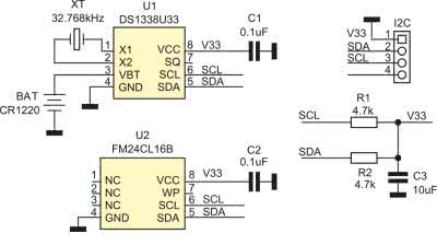 Schemat minimodułu został pokazany na rysunku 2. Układ U1 to zegar RTC typu DS1338 z dołączoną baterią podtrzymującą jego zasilanie – BAT, typu CR1220. Oprócz funkcji zegara czasu rzeczywistego realizuje też kalendarz i dodatkowo daje do dyspozycji 56 bajtów pamięci RAM. Współpracuje z miniaturowym rezonatorem kwarcowym 32,768 kHz i zawiera zintegrowany układ klucza zasilania bateryjnego.