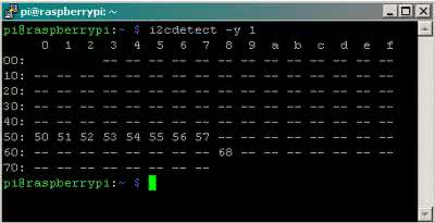 Posługując się biblioteką i2ctools, sprawdzamy obecność układów na magistrali (rysunek 4), za pomocą polecenia: