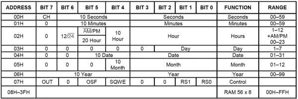 Pod adresem 0x68 znajduje się układ RTC DS1338, znaczenie poszczególnych rejestrów pokazuje fragment dokumentacji układu – rysunek 5.