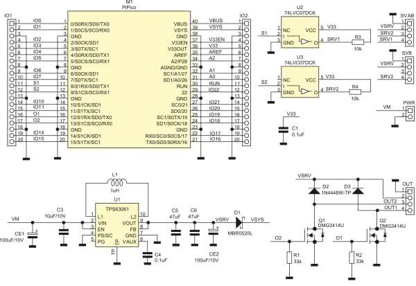 Serwomechanizmy zasilane są napięciem 5 V z wbudowanej przetwornicy. Sygnały PWM z wyprowadzeń 8 i 9 płytki Pi Pico są buforowane oraz wykonywana jest konwersja poziomów logicznych z 3,3 V do 5 V w układach U2, U3. Zastosowana przetwornica podwyższająco-obniżająca U1 typu TPS63061 jest zasilana z napięcia VM.