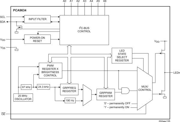 Uproszczony schemat wewnętrzny drugiego układu – PCA9634, został pokazany na rysunku 2. Sterowanie układem odbywa się poprzez magistralę I2C. Funkcje układu oraz jego konfiguracja i sterowanie zostaną omówione w dalszej części artykułu.
