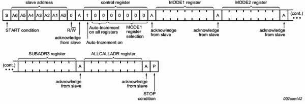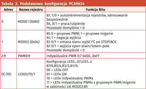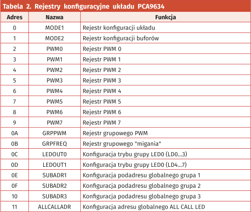 Strukturę rejestrów konfiguracyjnych układu PCA9634 zawiera tabela 2. W zależności od potrzeb możliwa jest komunikacja z poszczególnymi rejestrami poprzez adresowanie indywidualne rejestrów, wskazujące na konkretny rejestr, zgodnie z rysunkiem 5.