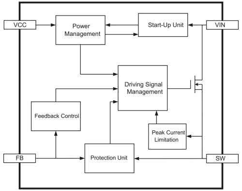 W roli sterownika przetwornicy wybrany został układ MP9488 firmy MPS, którego budowa wewnętrzna została pokazana na rysunku 1. Jest to uniwersalna przetwornica DC/DC ze zintegrowanym kluczem MOSFET, dopuszczalnym napięciem zasilania 450 V, prądzie przełączania do 0,5 A i wbudowanymi zabezpieczeniami. W modelu wybrano aplikację przetwornicy obniżającej (High-Side Buck).