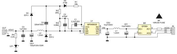 Stałe napięcie wejściowe doprowadzone jest do zacisków ACDC i DC złącza IN, mostek BR pełni w tym przypadku funkcję zabezpieczenia przed odwrotnym podłączeniem zasilania. Układ może być zasilany sieciowym napięciem przemiennym, w tym przypadku napięcie zasilania doprowadzone jest do zacisków ACDC i AC złącza IN, a mostek BR zapewnia prostowanie pełnookresowe. Kondensatory CE1, CE2 filtrują napięcie zasilania przetwornicy U1, dławik L1 pełni funkcję filtra zakłóceń. Dzielnik R2, R3 ustala wartość napięcia wyjściowego (Vfb=2,55 V). Schemat zasilacza jest pokazany na rysunku 2. Napięcie wyjściowe dostępne jest na złączu OUT, dioda LD1 sygnalizuje jego obecność i zapewnia wstępne obciążenie przetwornicy.