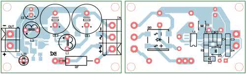 Układ zmontowany jest na niewielkiej jednostronnej płytce drukowanej, której schemat został pokazany na rysunku 3. Montaż nie wymaga opisu, należy tylko poprawnie przylutować pad termiczny układu U1 i dokładnie oczyścić płytkę z topników. Przed podłączeniem układu należy dokładnie sprawdzić poprawność montażu i jakość zastosowanych elementów, szczególnie kondensatorów, gdyż mają one kluczowy wpływ na działanie układu.