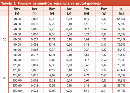 Wyniki pomiarów prototypu zestawiono w tabeli 1.