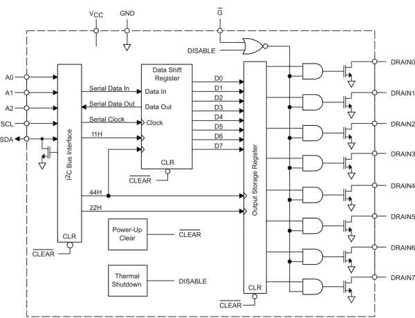 Konstrukcja modułu bazuje na układzie typu TPIC2810, którego schemat wewnętrzny został pokazany na rysunku 1. Wyjścia z otwartym drenem są aktywne w stanie niskim i zapewniają obciążalność do 100 mA (sumarycznie 210 mA), przy maksymalnym napięciu pracy 40 V. Umożliwiają bezpośrednie sterowanie statyczne zarówno szeregowych łańcuchów LED jak i pojedynczych LED o większej mocy.