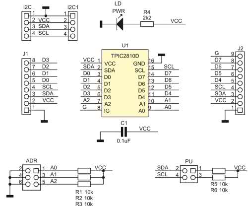 Schemat ideowy modułu został pokazany na rysunku 2. Moduł, oprócz układu U1 typu TPIC2810 ma trzy zworki A0...A2 umożliwiające ustalenie adresu oraz zworę PU umożliwiającą odłączenie rezystorów podciągających magistralę I2C – R5, R6. Pełna adresacja U1 umożliwia zastosowanie do 8 układów na jednej magistrali. Moduł może być zasilany napięciami z zakresu 3...5 V. Dioda LD sygnalizuje obecność zasilania. Wyjścia D0...D7 tolerują maksymalnie 40 V i są doprowadzone są do złącz J1 i J2. Dodatkowo wyprowadzono sygnał G wyłączający wszystkie wyjścia, aktywny w stanie wysokim. Sygnały magistrali I2C i zasilanie doprowadzone są do czteropinowego złącza typu EH – I2C zgodnego z Arduino oraz do złącza I2C1 typu JST o rozstawie 1 mm.
