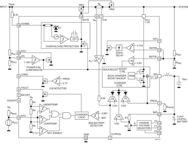 Dzięki zastosowaniu LTC4040 aplikacja zawiera niewiele elementów zewnętrznych ograniczających się do dzielników rezystorowych układów monitorowania napięć, klucza wykonawczego i elementów przetwornicy DC/DC (rysunek 2). Ładowarka i przetwornica wbudowana w LTC4040 ma wszystkie niezbędne zabezpieczenia wymagane do bezpiecznej eksploatacji akumulatorów.