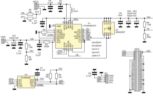 Sterowanie i monitorowanie ładowarki zapewnia układ uniwersalnego GPIO dla magistrali I2C, U2 typu PCA9536. Monitorowane są sygnały zaniku zasilania PFO (P0), statusu ładowania FLT (P1), CHG (P2), a sterowany jest sygnał wyłączenia ładowarki CHGE (P3).