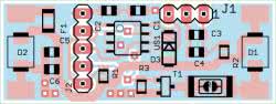 Układ został zmontowany na dwustronnej płytce drukowanej o wymiarach 40×15 mm. Jej schemat został pokazany na rysunku 2. Z uwagi na duży nacisk położony na miniaturyzację tej płytki nie znalazły się na niej żadne otwory montażowe, lecz można ją przymocować kroplą kleju na gorąco – ma niewielką masę.