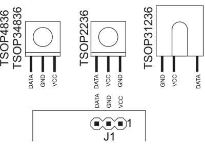 Montaż płytki proponuję przeprowadzić w sposób typowy, czyli rozpoczynając od elementów w obudowach do montażu powierzchniowego, a na koniec zostawić wlutowanie złączy przewlekanych. Zmontowany i gotowy do działania układ wygląda jak na fotografii tytułowej. Do zacisków złącza J1 należy podłączyć odbiornik podczerwieni. Różne typy tych układów mają różny układ wyprowadzeń. Układ prototypowy został przetestowany z TSOP34836, TSOP2236, TSOP4836 i TSOP31236. Szczegóły dotyczące ich podłączenia znajdują się na rysunku 3. Odbiornik nie musi znajdować się tuż przy płytce, ale warto zadbać o to, aby przewody łączące go z płytką były możliwie krótkie – mniej niż 1 m.