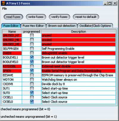Pamięć flash mikrokontrolera należy zaprogramować dostarczonym wsadem w postaci pliku HEX oraz należy zmień wartości bitów zabezpieczających – fuse-bitów. Nowe wartości to: High Fuse = 0xF9, Low Fuse = 0x7A. Szczegóły zostały pokazane na rysunku 4, który zawiera widok okna konfiguracji bitów zabezpieczających programu AVR Burn-O-Mat. W ten sposób zostanie wyłączony wbudowany dzielnik częstotliwości sygnału zegarowego przez 8. Ponadto obwód BOD (Brown-Out Detector) będzie aktywny i ustawiony na próg 4,3 V.