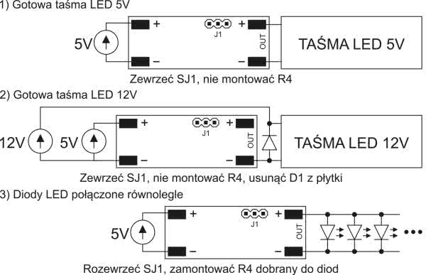 Ostatnią kwestią jest podłączenie diod LED do układu. Przewidziane są trzy sposoby: