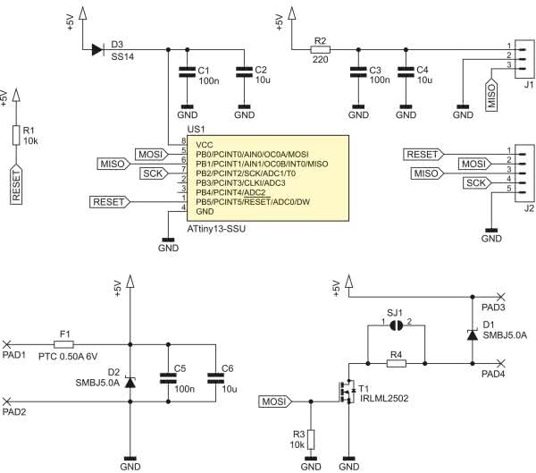 Jako stopień sterujący diodami został użyty tranzystor typu IRLML2502, który ma tak niskie napięcie progowe, że można sterować nim bezpośrednio z mikrokontrolera zasilanego napięciem 5 V. Zaciski wyjściowe układu – PAD3 i PAD4, również zostały zabezpieczone diodą typu transil, aby tranzystor nie został uszkodzony przez impulsy napięcia wytwarzane w trakcie przełączania indukcyjności długich przewodów połączeniowych. Prąd diod można zmniejszyć poprzez wlutowanie rezystora R4, lecz można go również pominąć i zewrzeć, nakładając kroplę spoiwa lutowniczego na zworkę SJ1 (zostanie to szerzej wyjaśnione w dalszej części artykułu). Rezystor R3 rozładowuje pojemność bramka-źródło wspomnianego tranzystora.