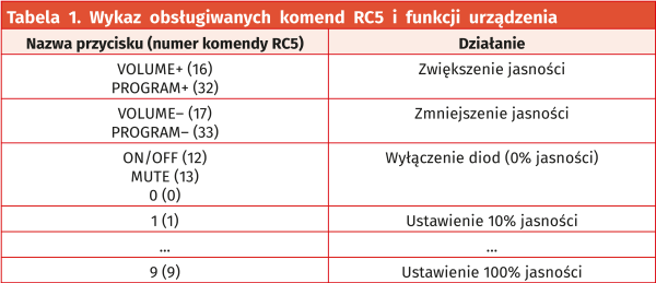 Prawidłowo zmontowany i podłączony układ jest gotowy do pracy. Do sterowania nim można zastosować dowolny pilot od telewizora, który nadaje w standardzie RC5. Wykaz obsługiwanych funkcji i komend znajduje się w tabeli 1.