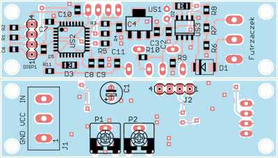 Układ został zmontowany na dwustronnej płytce drukowanej o wymiarach 70×20 mm. Jej schemat prezentuje rysunek 2. W odległości 3 mm od krawędzi płytki znalazło się miejsce dla otworów montażowych, każdy o średnicy 3,2 mm.