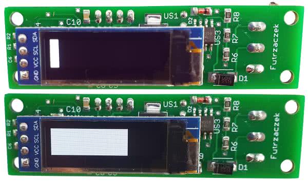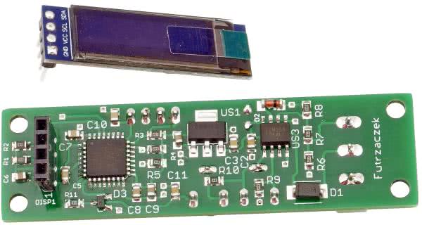 Wyświetlacz OLED komunikuje się z mikrokontrolerem poprzez prostą magistralę I2C. Rezystory podciągające jej linie sygnałowe mają stosunkowo niewielką rezystancję (1 kΩ), aby możliwie zmniejszyć stałą czasową ładowania pojemności wszystkich pojemności pasożytniczych. W tym układzie jest to o tyle ważne, że I2C pracuje z pełną możliwą szybkością (400 kHz). Dzięki temu następuje szybka aktualizacja zawartości wyświetlacza.