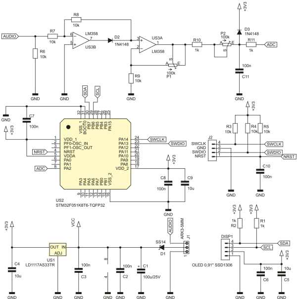 Ostatnim blokiem na schemacie jest układ dopasowujący sygnał audio do przetwornika ADC mikrokontrolera. Jego wejścia obsługują jedynie sygnał unipolarny z przedziału od 0 V do 3,3 V. Natomiast sygnał audio jest bipolarny i ma niewielka amplitudę. O ile dodanie składowej stałej do sygnału audio, która ma uczynić z niego sygnał unipolarny nie jest skomplikowane, o tyle zwiększenie jego amplitudy jest już nieco trudniejsze.