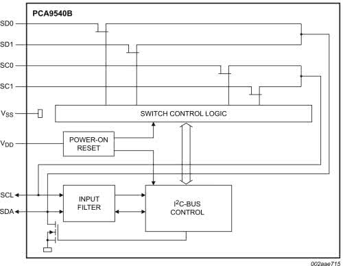 Moduł zawiera układ dwukanałowego multipleksera magistrali I2C typu PCA9540B, którego schemat wewnętrzny został pokazany na rysunku 1. Aktywny kanał jest wybierany poprzez bezpośrednią konfigurację jednego rejestru i nie wymaga dodatkowych wyprowadzeń sterujących.